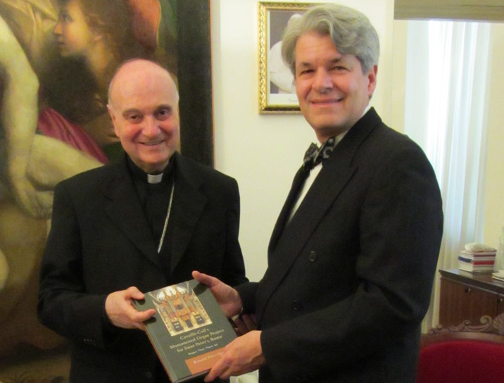 Ronald Ebrecht, Artist in Residence and University Organist of Wesleyan University, had a residency in Rome in May at the Conservatorio Santa Cecilia. During this time, he also presented copies of his new book, Cavaillé-Coll’s Monumental Organ Project for Saint Peter’s Rome, Bigger Than Them All, to the various archives he used for research at the Vatican. The presentation ceremony on May 24 was hosted by His Eminence Angelo Cardinal Comastri, President of the Fabbrica di S. Pietro in Vaticano. (Comastri left, Ebrecht right). |