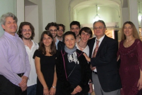 Fourteen hours of masterclasses at the Conservatorio allowed ample time in-depth analysis and discussion of various works for the large organ studio of his conservatory host, Professor Alessandro Licata. (photo 2, Ebrecht far left, students, Licata second from right). Ebrecht’s concluding recital on the four manual Walcker/Tamburini organ in the Academic Hall of the conservatory included works of Bach, Brahms, Bruce, Mozart, Price, Sowande, and the Ebrecht re-edition of Duruflé Scherzo opus 2 and Veni Creator opus 4. |
