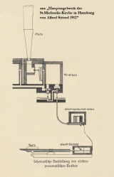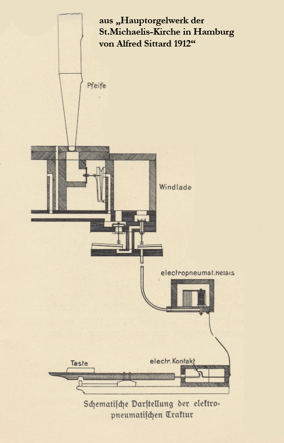 diese Grafik zeigt eine originale "elektropnneumatische Traktur" zu einer Hängebalglade. Neue Orgeln wurden praktisch nur in der Zeit von 1905-1915 mit diesem System von Walcker gebaut. Später hat man, um in der Terminologie Oscar Walckers zu bleiben, "elektrische" Orgeln gebaut, wo die pneumatische Ansteuerung der Windladen, wie hier, nicht mehr zur Diskussion stand.