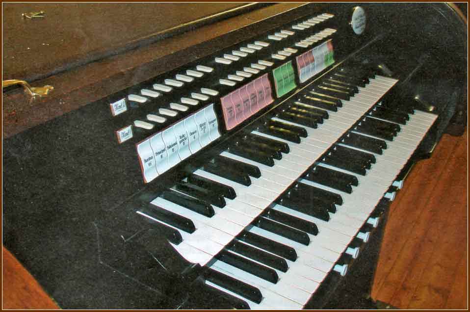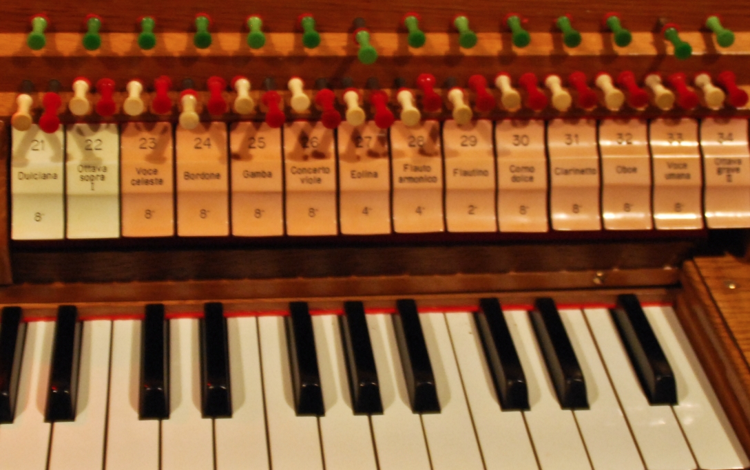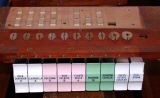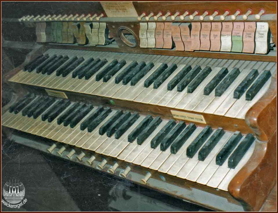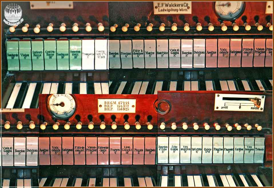 Die hier besprochenen Registertasten wurden etwa von 1890 bis 1914 verrwendet in zwei grundsätzlich verschiedenen Größen. Sie zeichnen sich dadurch aus, dass ihre Farbgestaltung für rasche und angenehme Übersicht sorgen. So ist das I.Hauptmanual immer in weiß gehalten, das Pedal ist grün, das II.Manual rosa, dann III.Manual gelb. Bei den Koppeln werden zwei Farben eingesetzt. Links befinden sich die Baß-, rechts die Superkoppeln. Im Zentrum bewegt sich die Crescendo-Uhr exakt in den Zahlenstufungen, wie Register eingestellt sind.