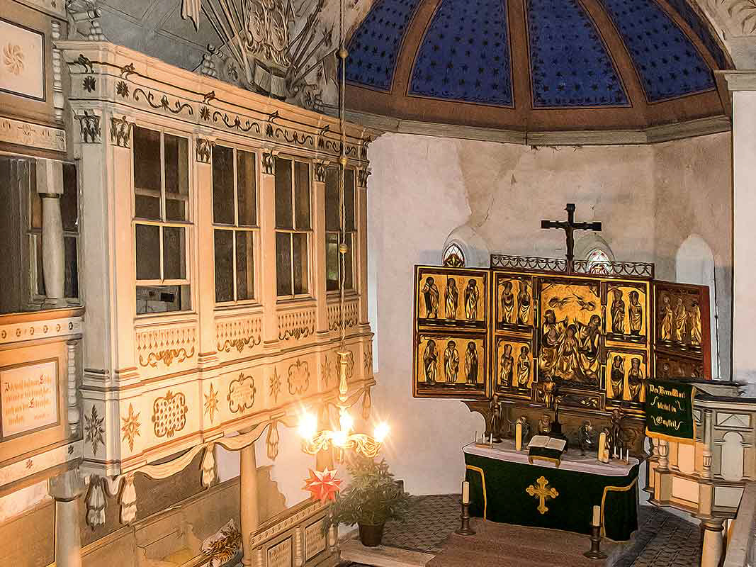 Dabei fallen die Kirchen besonders auf in ihrer eigenartigen Statur, oft mit Krüppelwalmdächern ausgestatten, aber nicht zu vergleichen mit den geputzten Kirchlein in Bayern, Baden oder Württemberg.