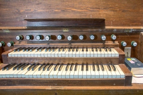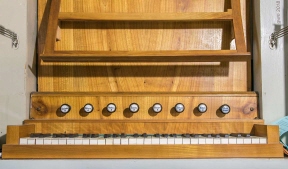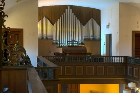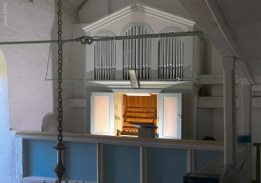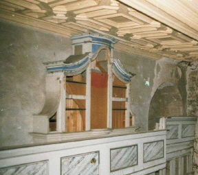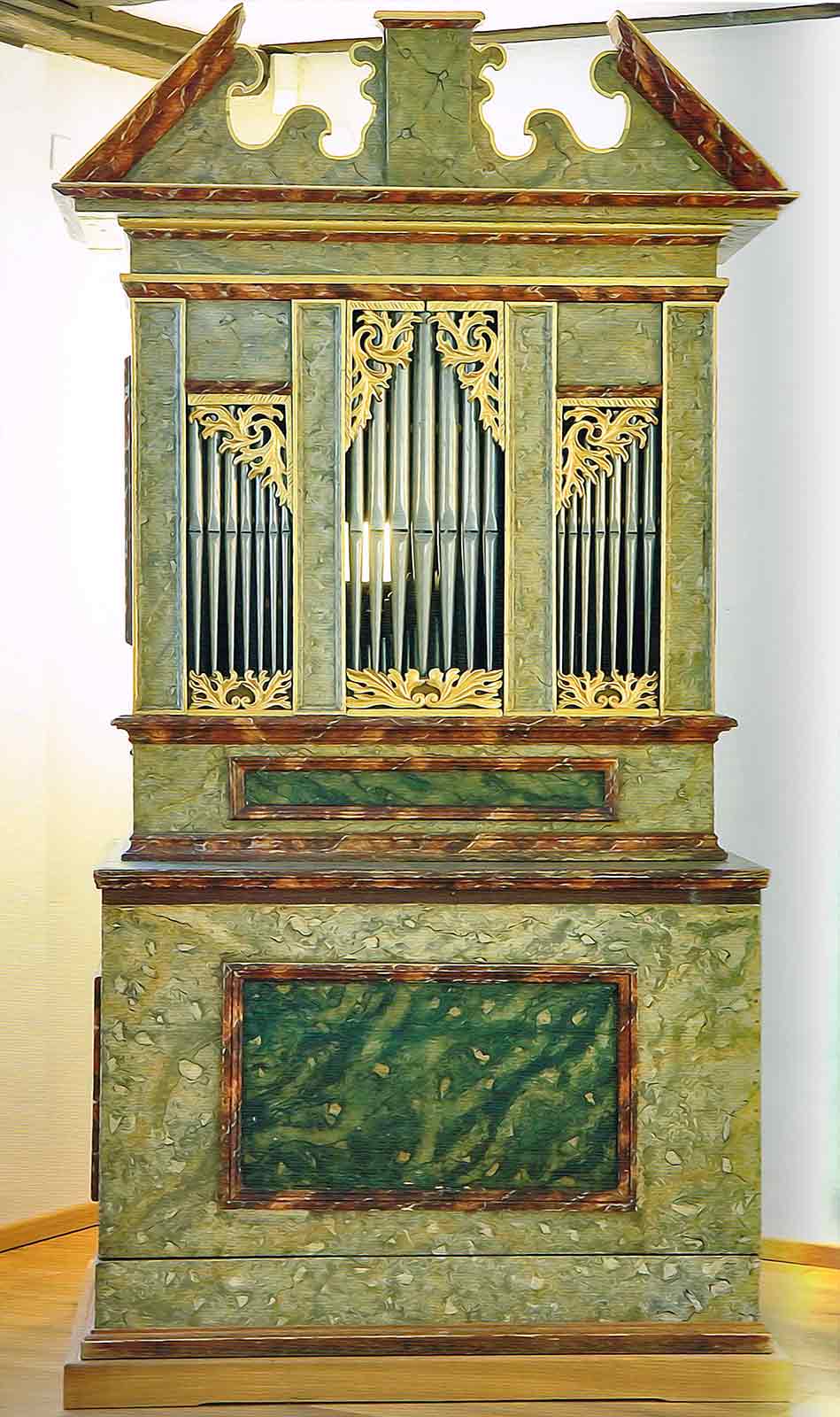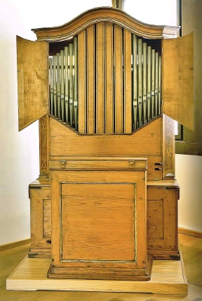 Manual C-f''' 1. Gedackt 8’ 2. Octave 4’ 3. Aeoline 8’ jetzt Flöte 4’ 4. Gamba 8’ 5. Principal 8’ Pedal C- c' Subbass 16’ Violon 8’ Pedal Koppel |