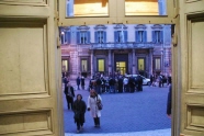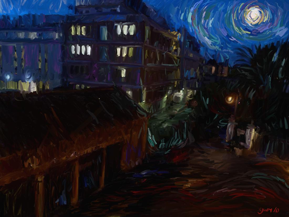Wenn es Nacht wird in Rom und so jede Straßenecke bei Vollmond ein nahezu unkeusches Gelüst nach einer extremen Situation offenbart. Wie hier, wo man fragt: war ein Mord?, ist Blut geflossen? Und dann stellt sich heraus, dass nur ein erschöpfter Orgelbauer sich ein kleines Bildlein gemalt hat, statts schweigsam in Büchern zu lesen oder nur brav den Bachschen Fugen zu lauschen. Im Angesichte der hier in Rom stattfindenden Ausstellung "Vincent van.." macht er noch einen Stilschwenker ins pinseldrappierende Nach-und Nachtmalen. So wird das "Ospidale San Giovanni", ein christliches Krankenhaus, bei dem morgens in Reih und Glied, richtig anständig die Schwesterschülerinnen einmarschieren, gegenüber seinem nur schwach beleuchteten Zimmerlein, nun in ndranghetanisches Blutrot getaucht. Und als die Lichter Leuchtstrahlen werfen, wie beim sonntagabendlichen Tatort, meinte man Aufschreie zu hören. Doch es war nichts aufzuklären. Phantasien eben, eines unter tamburinischen Intonations-Schüttelfieber-Leidenden. Nun anstelle Stimmhörner Pinsel in Händen haltend.
