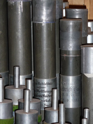 Was das Pfeifenwerk besonders wertvoll macht, ist der Umstand, dass diese Pfeifen Inschriften als Kriegerdenkmal des Ersten Weltkriegs haben.