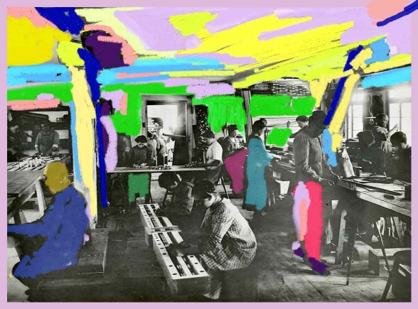 Wie wurde früher bei Walcker gearbeitet? so eine Frage, die immer wieder an uns gestellt wird. Natürlich alles sehr bunt, wie man sieht, aber das nachfolgende (leicht colorierte) Foto, zeigt noch eine andere Weisheit, nämlich den Umstand, dass die beiden Lehrbuben im Vordergrund sich gerade mit einer "Hängebälgchenlade" beschäftigen. Ebenso sehen wir eine solche Lade links im Hintergrund. Dies waren die Anlässe, uns mit diesem Foto etwas intensiver zu beschäftigen, denn wenn man sich mit der Vergangenheit beschäftigt, dann ist jedes einzelne Detail wichtig. Und die unnötigen Details sollte man sofort wieder vergessen bzw. tief in laute Farbe hüllen. |